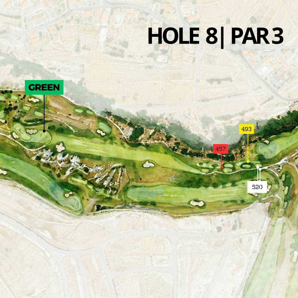 Existe um lago antes do green e dois bunkers posicionados depois do mesmo. Recomenda-se um ferro comprido, com especial atenção à distância.