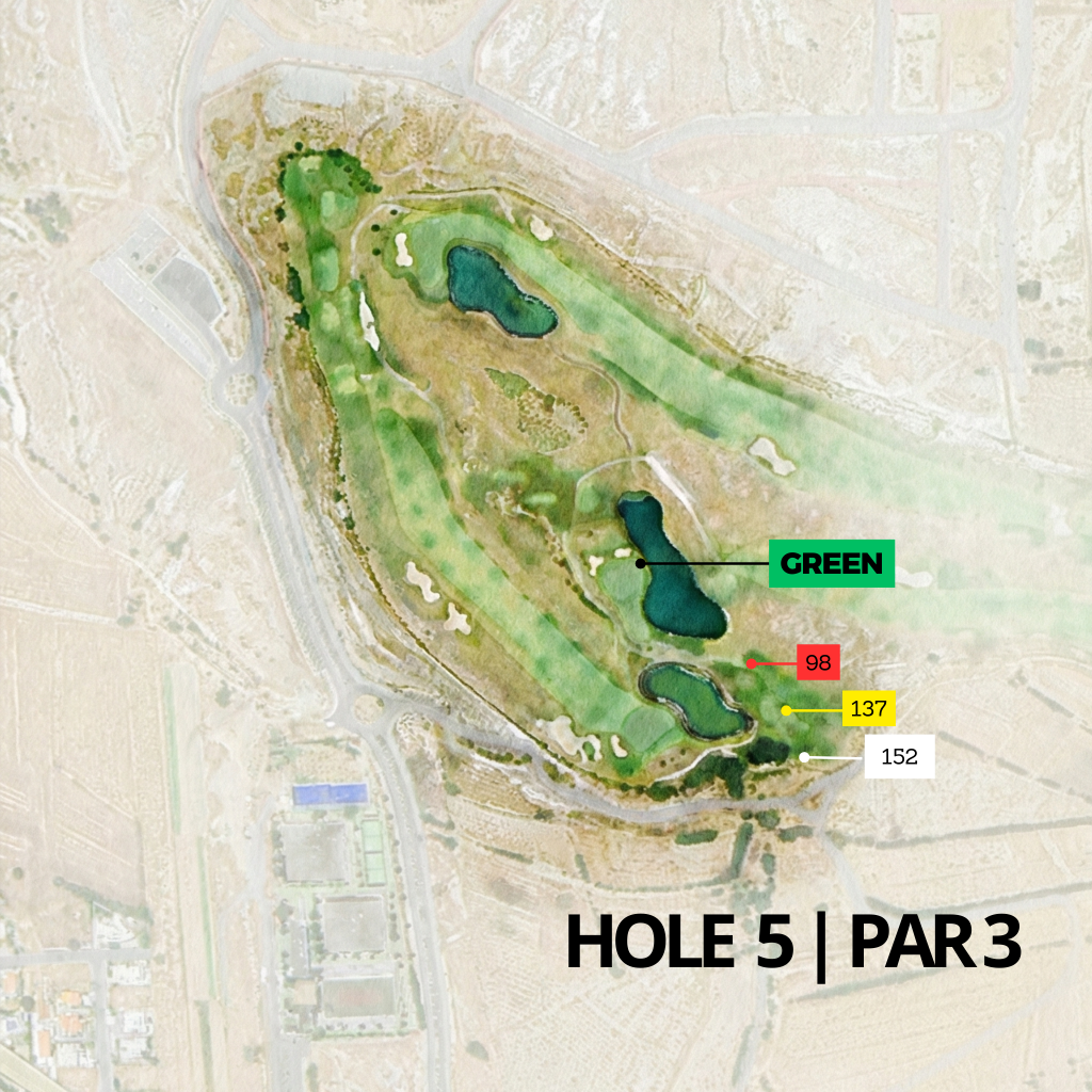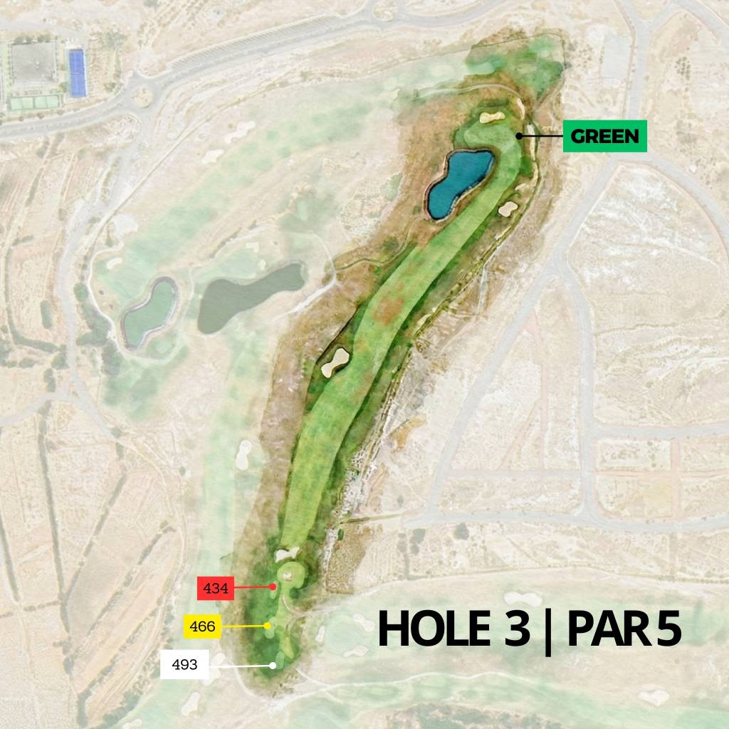 O segundo shot deverá ser jogado com um ferro para antes do lago. A terceira pancada será de cerca de 100 metros, sobrevoando o lago, para um green com um bunker localizado depois do mesmo.