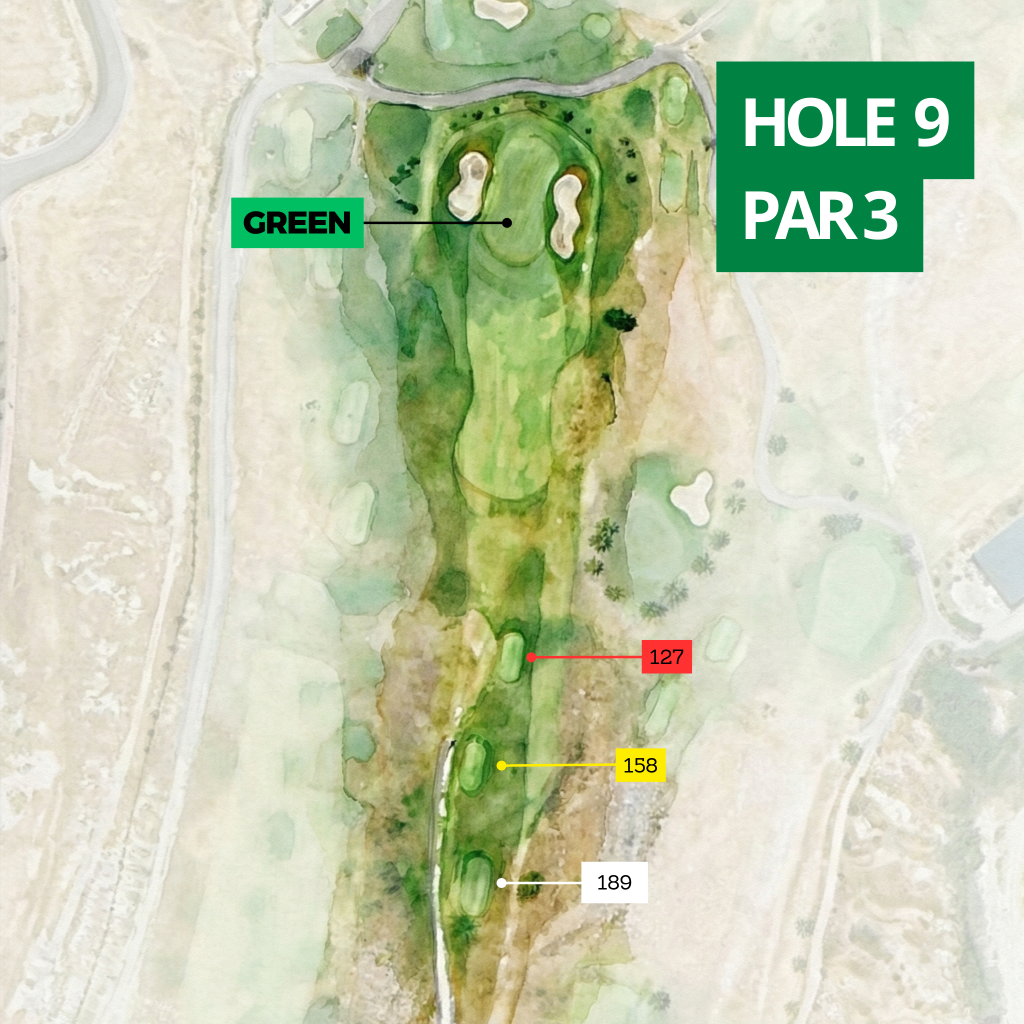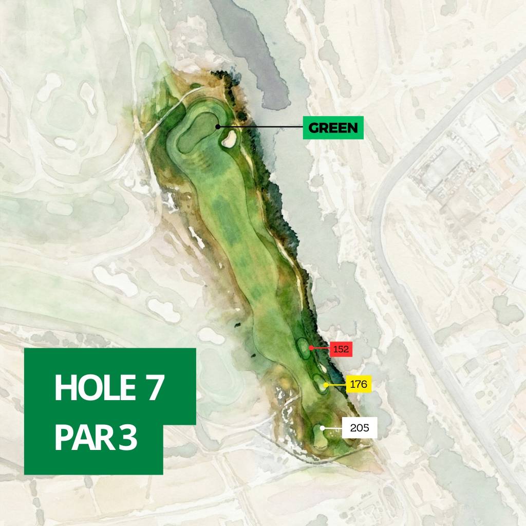 Recomenda-se um taco que percorra aproximadamente 180 metros. O green encontra-se ligeiramente elevado e protegido por um bunker no lado direito.